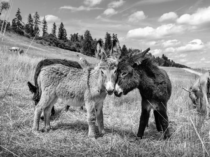 Mit liebevollen Gesten und neugierigen Blicken begegnen sich die vier knuffigen Esel auf der sonnigen Wiese – ein Bild voller Wärme und sanfter Verbundenheit.