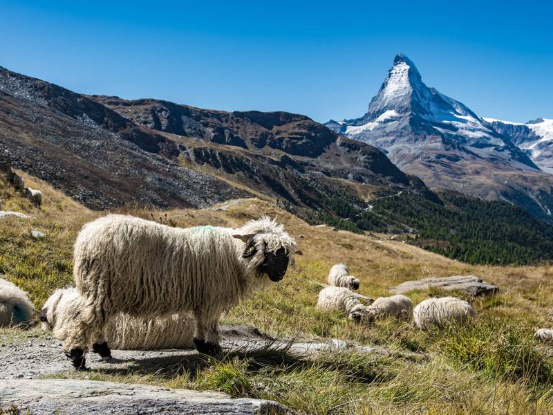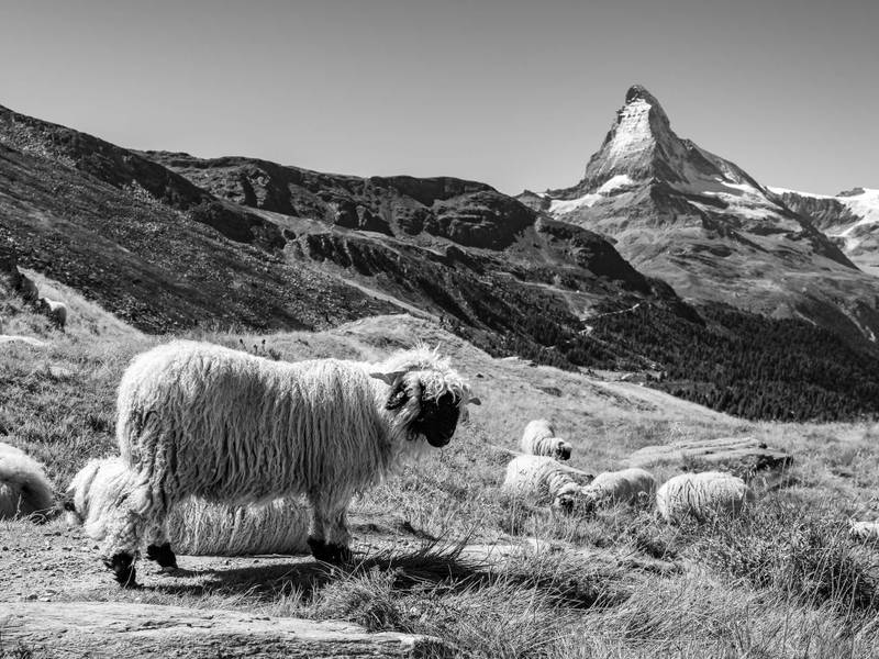 Die Schwarznasenschafe strahlen Ruhe und Harmonie inmitten der majestätischen Berglandschaft aus. Das beeindruckende Matterhorn im Hintergrund lädt dazu ein, die Natur zu genießen und den Moment zu schätzen. Lass dich von dieser friedlichen Szene inspirieren und finde deine eigene Verbindung zur Schönheit der Berge.