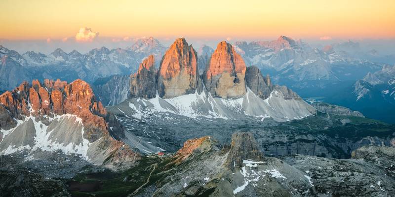 Es wurde bereits hell, wo das Schotterfeld noch lange kein Ende zu kennen schien. Doch mit letzten Kräften und in letzter Minute, erreichten wir unser morgendliches Ziel. Ich baute meine Kamera auf und durfte dieses einmalige Bild, der Drei Zinnen, von der Dreischusterplatte in den Sextner Dolomiten auf 2.957 m Höhe aufnehmen.