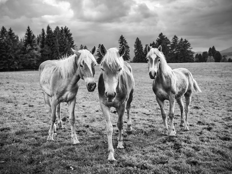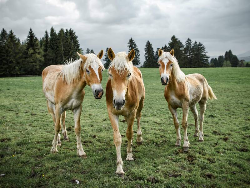 Drei prächtige Haflinger Fohlen treten euch neugierig und voller Anmut entgegen, ihre goldene Mähne weht sanft im Wind – ein Bild von Eleganz und natürlicher Schönheit.