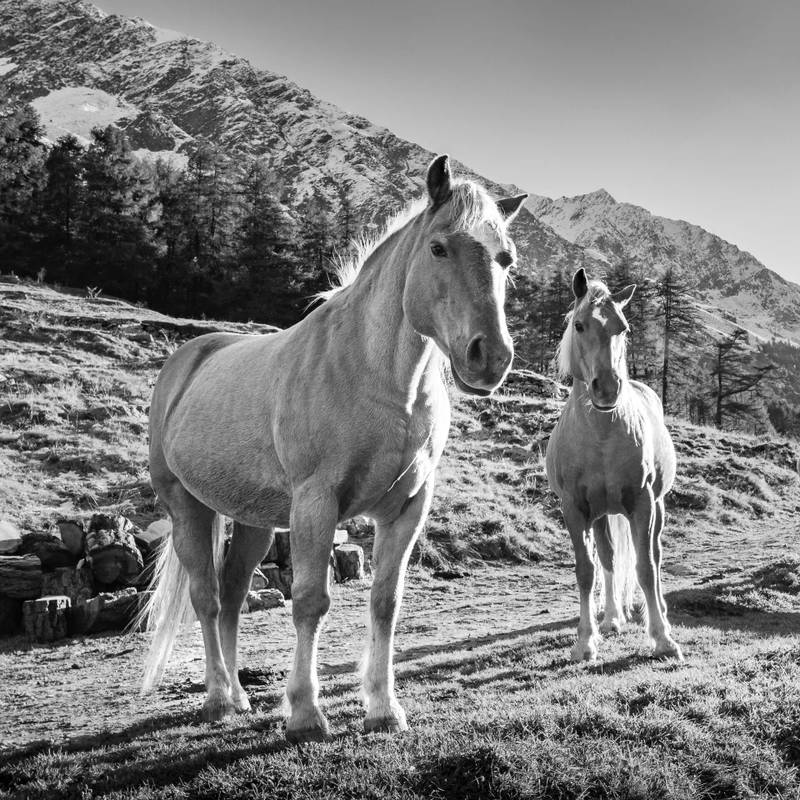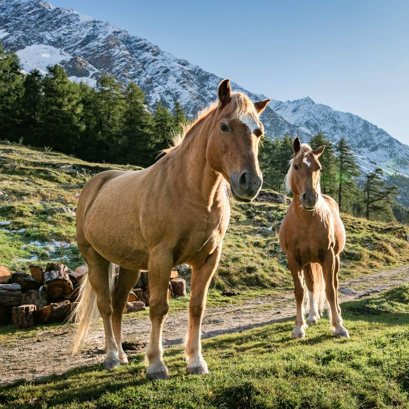 Zwei prächtige Haflinger Pferde genießen die morgendliche Sonne af der Almwiese hinter der Mitterkaser Alm in Südtirol. Spüre die alpine Geborgenheit und synchronisiere Dich mit der Kraft dieser edlen Pferde jeden Tag.
