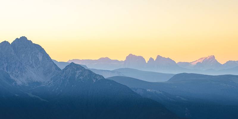 Königlicher Blick auf namhafte Südtiroler Berge. Links im Vordergrund der Hirzer, direkt dahinter die Sellagruppe, gefolgt von Lang-und-Plattkofel und zu guter Letzt die Königin der Dolomiten, Die Marmolada. Aufgenommen im Abendrot.