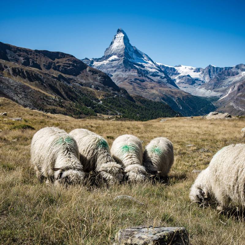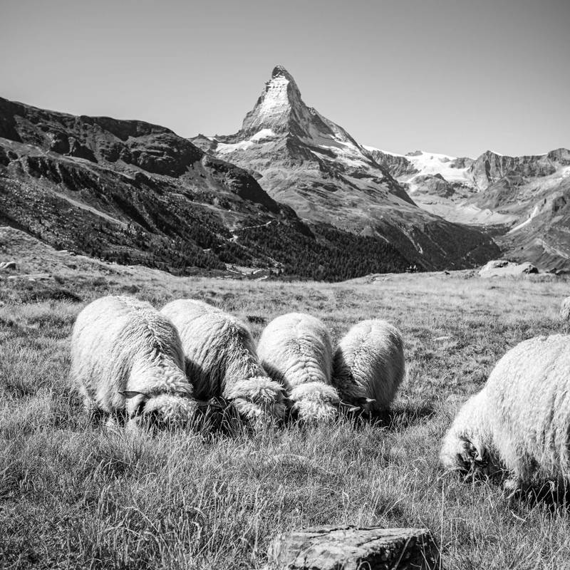 Zwei Wahrzeichen von Zermatt – die Schwarznasenschafe & das Matterhorn. Die friedliche Einheit der Tiere in Kombination mit diesem faszinierenden Berg, symbolisieren die Verbindung von Natur und Tradition – ein Bild voller Harmonie und alpiner Gelassenheit. Mit diesem Bild förderst Du das Gemeinschaftsgefühl und unterstreichst eine natürliche und warme Atmosphäre.