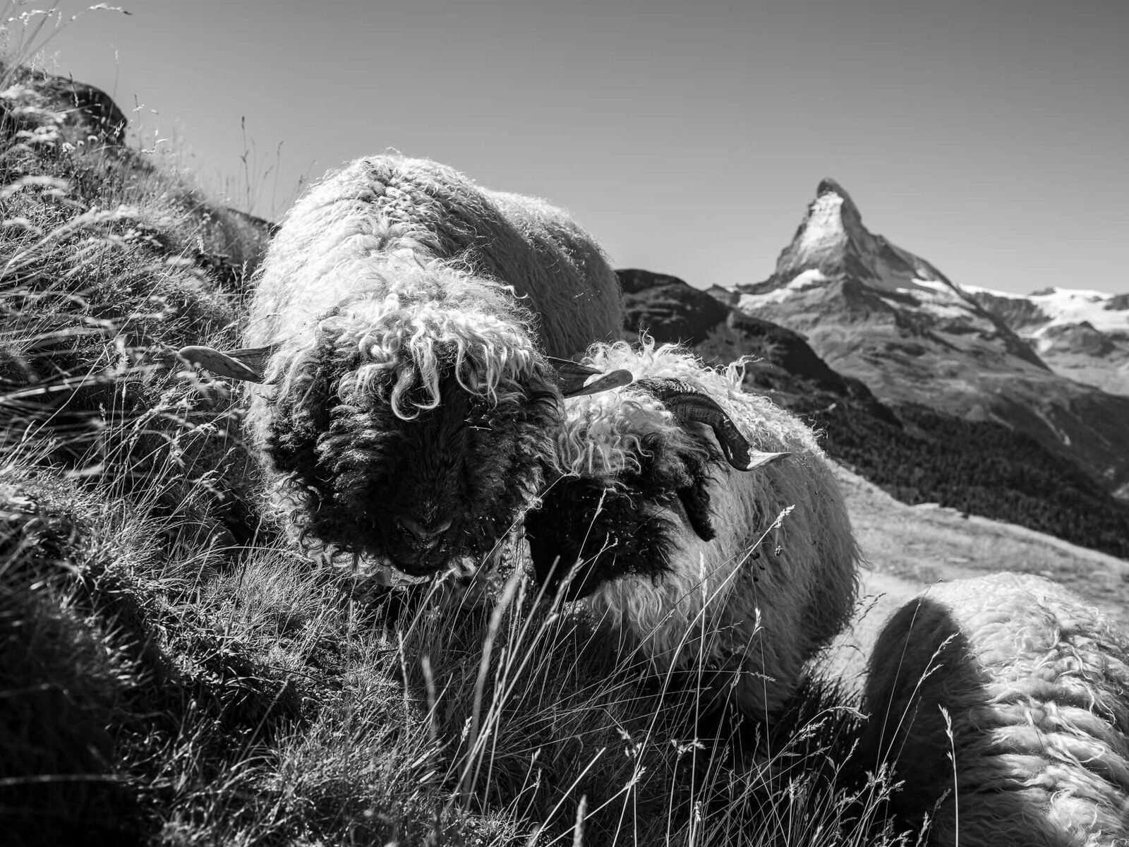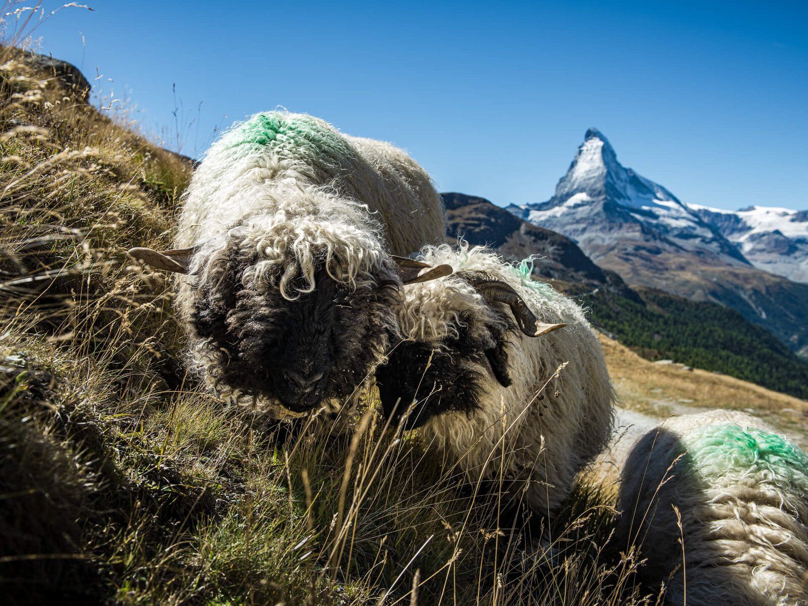 Majestätisch erheben sich die Schwarznasenschafe vor der atemberaubenden Kulisse des Matterhorns, ihr dichtes Fell sanft von der Bergsonne beleuchtet – ein Bild, das die Schönheit der Natur und die Ruhe der Alpen widerspiegelt.