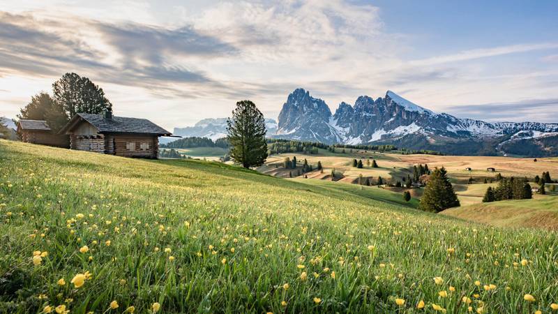 Die Seiser Alm ist nicht nur die größte Hochalm Europas, sondern zählt auch zu den Schönsten. Frühlingshafter Ausblick auf Langkofel und Plattkofel.