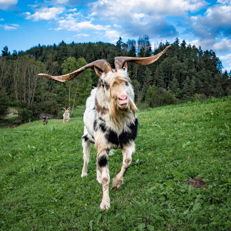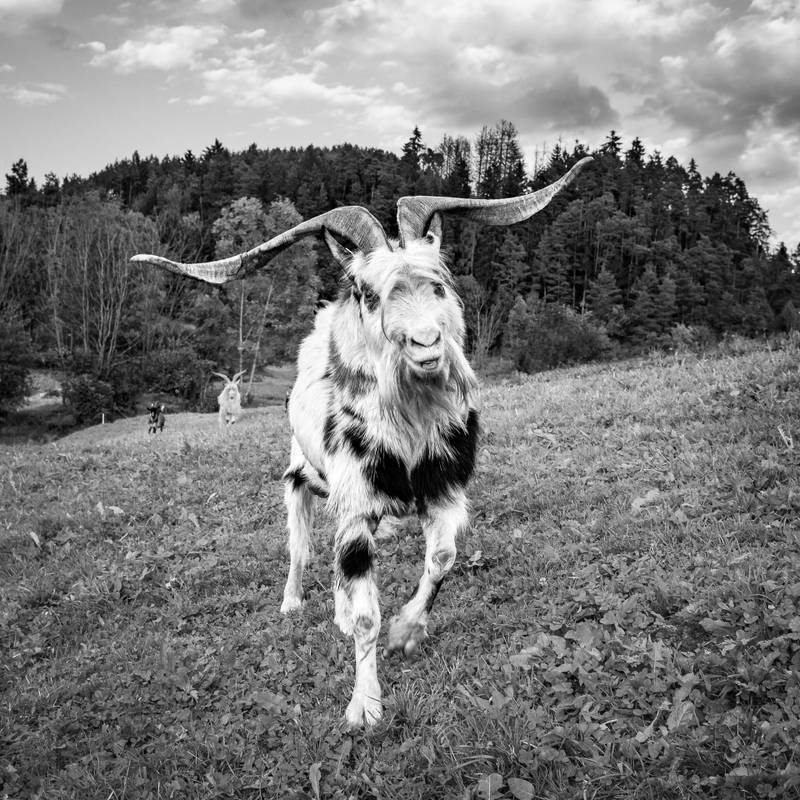 Dieser Ziegenbock hat mir einiges abverlangt. Mit seinen beeindruckenden Hörnern voran hat er mich quer über die Wiese auf und ab gejagt. Bestimmt 30 Mal habe ich versucht, ihm ein paar Meter voraus zu sein um ihn ablichten zu können. Dieses Bild belebt und energetisiert Deine leeren Wände.
